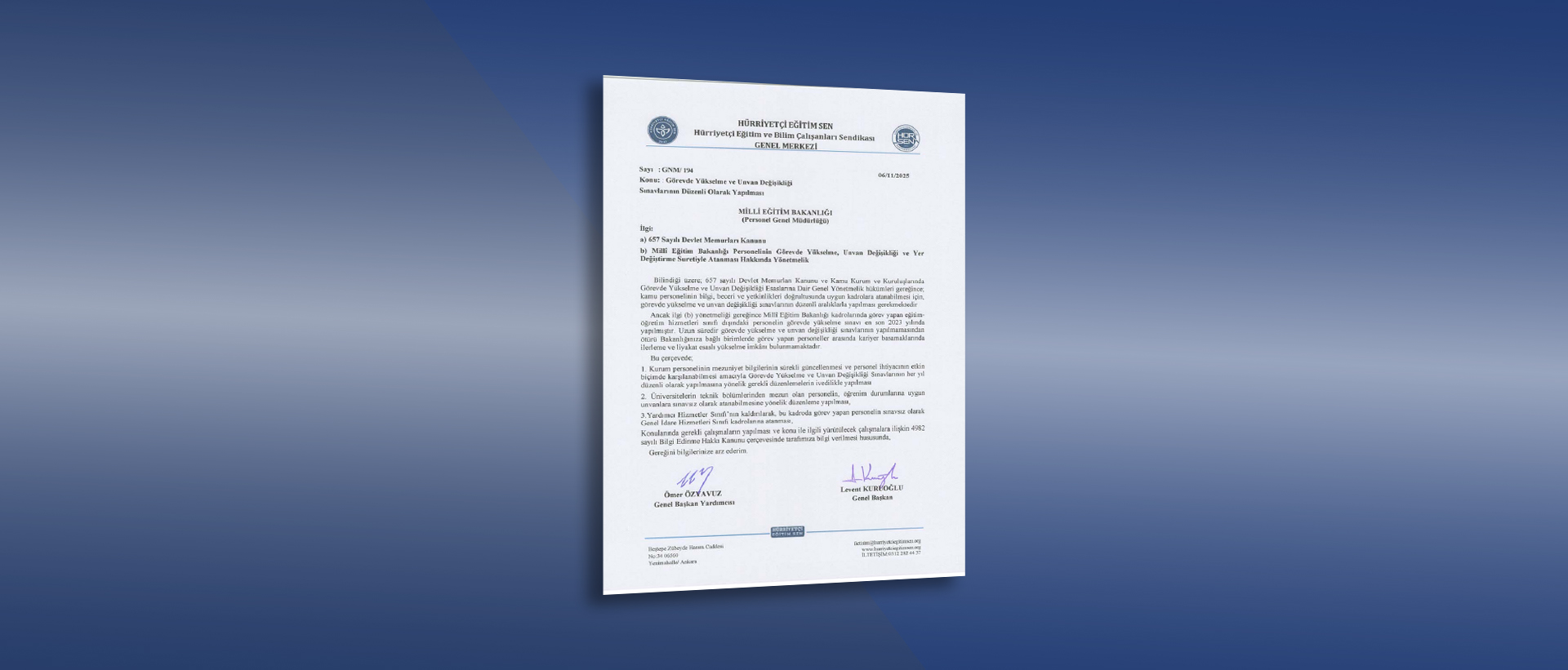 Görevde Yükselme ve Unvan Değişikliği Sınavlarının Düzenli Olarak Yapılmasını Bakanlıktan Talep Ettik