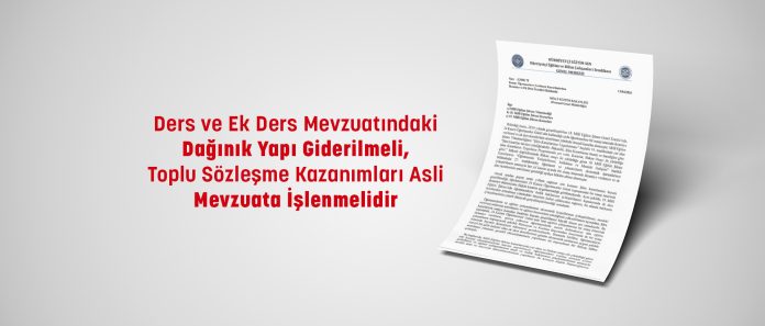Millî Eğitim Bakanlığı yönetici ve öğretmenlerinin ders ve ek ders saatlerine ilişkin mevzuatının; çok sayıda değişiklik, genelge, toplu sözleşme hükmü ve görüş yazıları nedeniyle dağınık ve karmaşık bir yapıya dönüşmesi sebebiyle uygulamada birlikteliğin sağlanması, tereddütlerin giderilmesi ve hukuki belirliliğin temin edilmesi amacıyla mevcut düzenlemelerin günümüz şartlarına göre yeniden ele alınarak toplu sözleşmelerle elde edilen ek ders ve mali hakların doğrudan mevzuata işlenmesini Millî Eğitim Bakanlığı’ndan talep ettik.